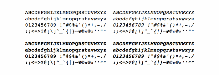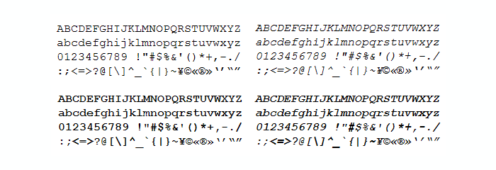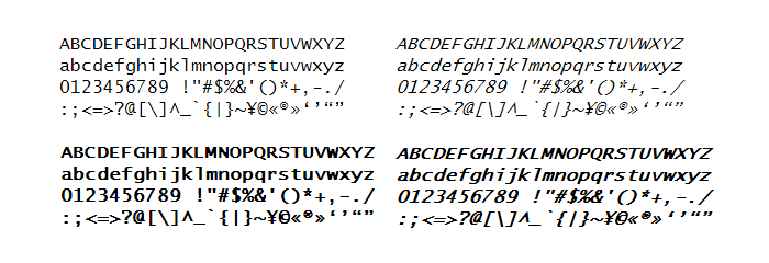 このほかに Windows でインストール率の高い等幅フォントとして Lucida Console があるが、Monaco などと同様にイタリックとボールドを持たないため、あまりおすすめしない。
