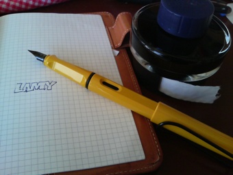 はじめて万年筆を買った。Lamy safari のイエロー、ニブは EF。カートリッジではなくコンバータを使うことにして、インクはブルーブラックを選んだ。お店は高田馬場の 竹宝商会。