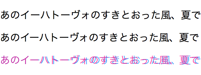 このうち optimizeSpeed と geometricPrecision は違いがよくわからなかったのですが、optimizeLegibility はカーニングと合字 (リガチャ) をうまい具合に調整してくれるもので、現実世界でもけっこう使えそうです。ただフォントがカーニングや合字のデータを持っていなければ指定しても何も起こりません。和文フォントでは、メイリオと MS 系ゴシック・明朝は効果がないですが、ヒラギノ角ゴ・明朝は軽くカーニングが調整されます。